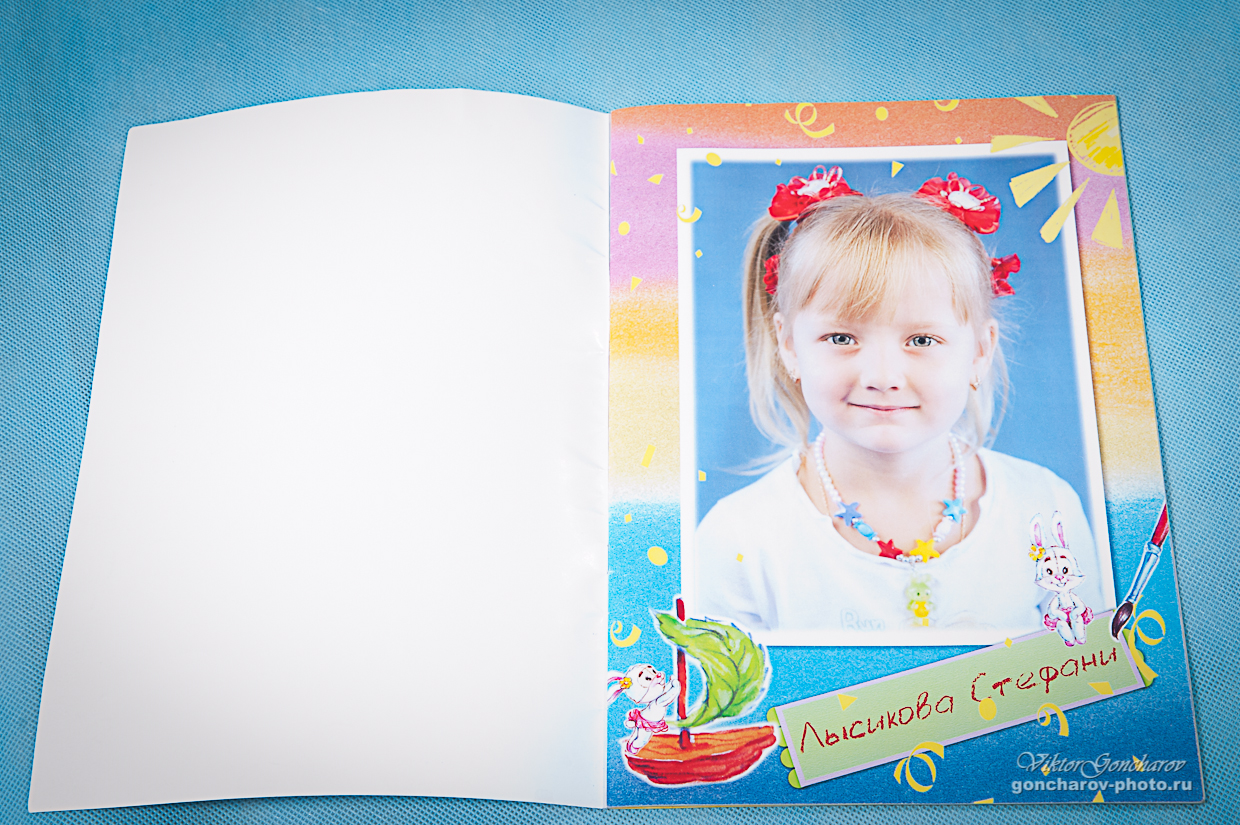 Так же кроме выпускных альбомов - фотокниг, мы изготавливаем не дорогой по цене, и не уступающий по качеству фото печати, вариант папка "трюмо". В таком выпускном альбоме на шести страницах использованы портреты выпускников и педагогов детского сада, альбом раскладывается на три части.